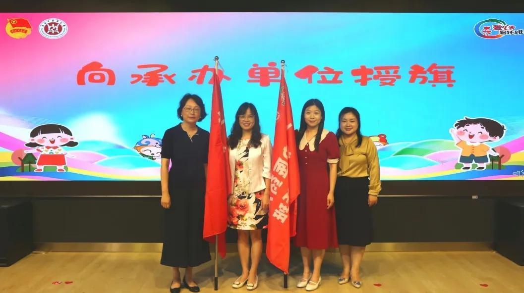 孟煜、周薇为两家承办单位中药学院与公共健康学院授予爱心暑托班旗帜。