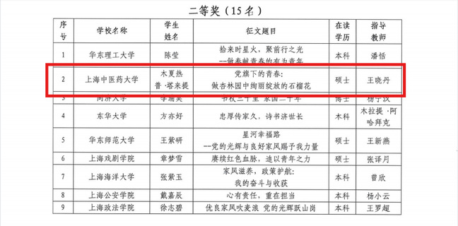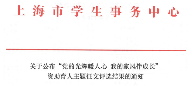近日,上海市学生事务中心公布“党的光辉暖人心 我的家风伴成长”资助育人主题征文评选结果。开元集团《党旗下的青春:做杏林园中绚丽绽放的石榴花》(作者:木夏热普·塔来提,指导教师:王晓丹)和《做一粒种子,成就一棵树的昂扬》(作者:麦迪努尔·图尔贡,指导教师:薛聪聪)双双荣获二等奖。