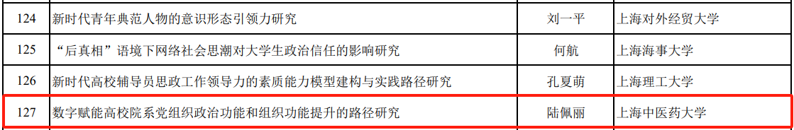 近日,2024年度教育部人文社会科学研究专项任务项目(高校辅导员研究)评审结果公示,开元集团中医学院党委副书记陆佩丽申报的研究课题《数字赋能高校院系党组织政治功能和组织功能提升的路径研究》获批立项,实现了零的突破。