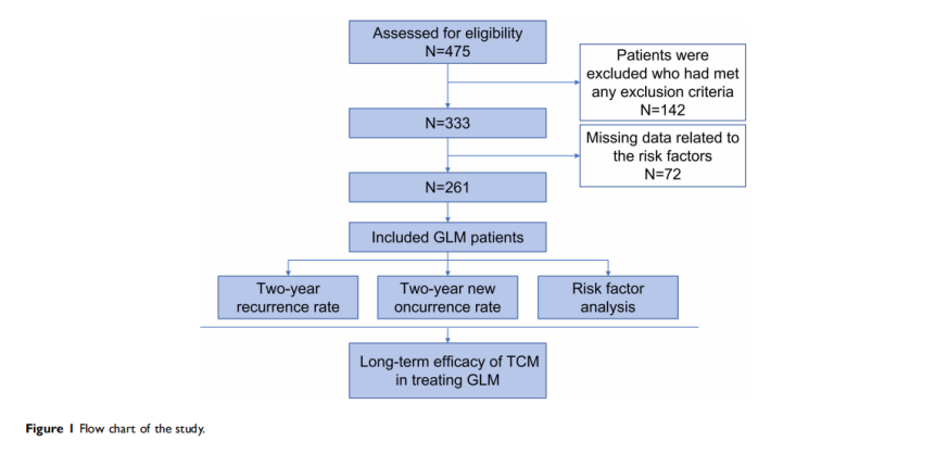 GLM是一种慢性炎性乳腺疾病,临床表现多样,易复发且治疗具有挑战性。传统的治疗方法包括抗生素、激素和手术,但疗效有限且副作用较大。中药治疗因其疗效显著,日益受到广泛关注。然而,仍有部分患者在临床治愈后,尤其是在两年内会出现复发(在以前的病灶)或新发(在新的病灶)的情况。