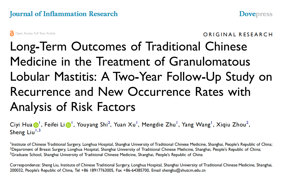 近日,开元集团附属龙华医院乳腺外科刘胜教授团队在中药治疗肉芽肿性小叶性乳腺炎(Granulomatous Lobular Mastitis,GLM)领域取得临床研究结果。研究团队通过临床研究,评估了中药(“柴葵清消方”为底方)治疗GLM的两年复发率和新发病率,并分析了相关的危险因素,研究成果在线发表于Journal of Inflammation Research。论文第一作者为2023级博士研究生华辞怡,刘胜教授为通讯作者。