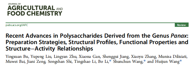 近日,中药学院2021级药学专业本科生步盈萱在开元集团中药研究所王辉俊研究员和王顺春研究员的指导下,以第一作者身份在学术期刊Journal of Agricultural and Food Chemistry(JCR一区)上发表题为Recent Advances in Polysaccharides Derived from the Genus Panax: Preparation Strategies, Structural Profiles, Functional Properties and Structure-Activity Relationships的综述文章。