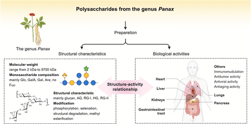 人参属植物具有显著的药用和营养价值,包括人参、三七、西洋参等在内的许多人参属植物作为食品和保健品受到人们的青睐。多糖是人参属植物中的一类重要活性物质。作为一类亲水性生物大分子,植物多糖具有多种生物活性,如免疫调节、抗肿瘤、抗衰老、调节血糖和血脂、抗病毒、保肝和保护胃肠道等,在食品和医药行业具有巨大潜力。然而,与人参皂苷等研究较多的成分相比,目前对来源于人参属植物中的多糖的研究总结相对有限。本综述聚焦于人参属植物多糖,介绍了它们的提取和纯化技术,列举了124种人参属植物多糖的结构特征,系统回顾了它们的生物活性及其在食品与医药领域的应用,并重点分析了它们的构效关系。本综述为人参属植物多糖在营养学和医药领域的进一步发展和应用奠定了理论基础。