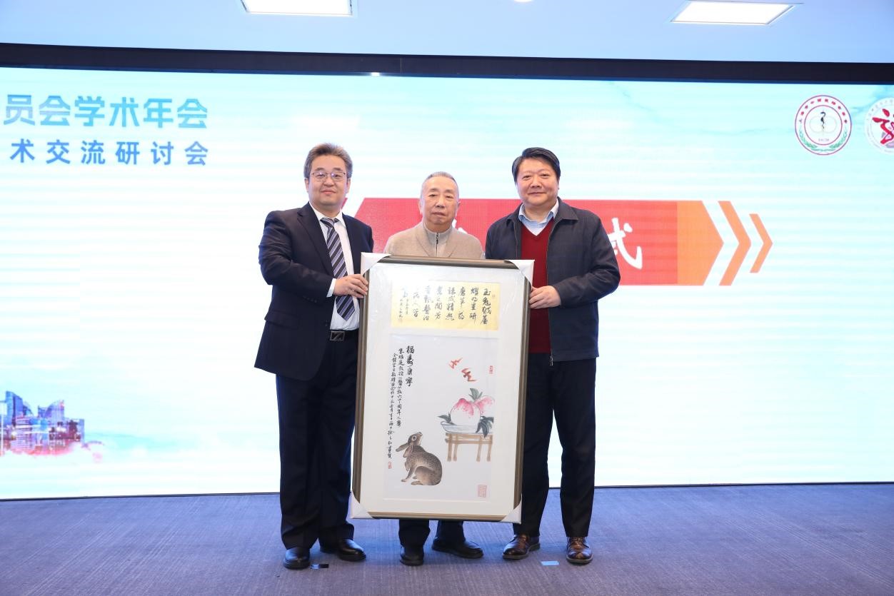 张嗣博与龙华医院普外一科李炯主任医师作为学生代表向朱培庭教授敬献《福寿康宁图》。