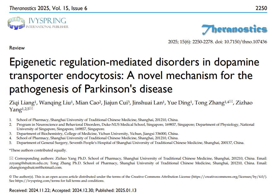 近日,中药学院张彤教授/杨子钊研究员团队在国际知名期刊Theranostics上发表了题为Epigenetic regulation-mediated disorders in dopamine transporter endocytosis: A novel mechanism for the pathogenesis of Parkinson's disease的综述文章,系统性地探讨了DNA甲基化、RNA修饰、组蛋白信号更替及非编码RNA调控等表观遗传机制对多巴胺转运体(Dopamine Transporter, DAT)内吞作用的影响,揭示了这些表观遗传调控方式通过激活DAT内吞作用来影响多巴胺能神经元的存活和功能,进而诱发帕金森病(Parkinson's disease, PD)产生及发展的新机制。本综述为PD的发病机制提供了全新的视角和理论框架,不仅为早期临床诊断指明了潜在方向,还为后期治疗揭示了潜在药物靶点,为其分子病理机制的研究奠定了坚实的科学基础。