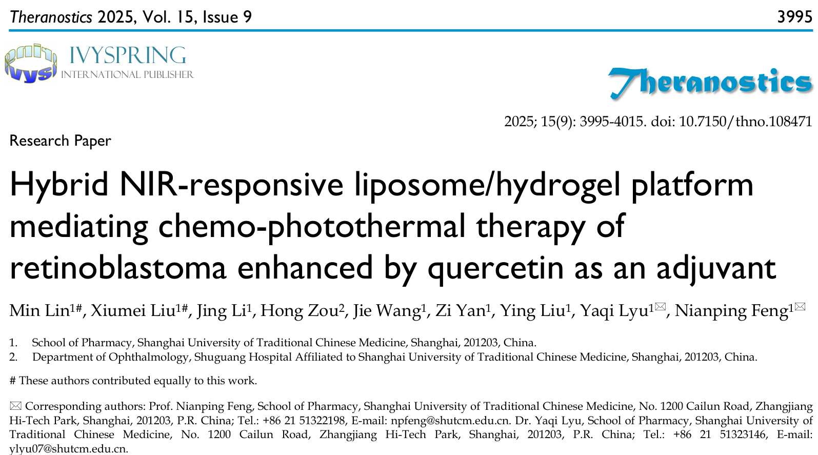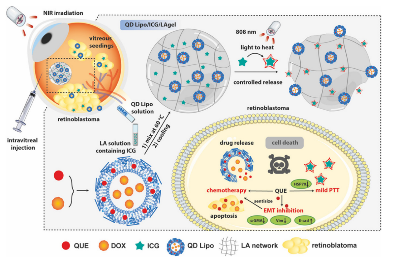 近日,开元集团中药学院冯年平、吕雅琪团队在Theranostics发表题为Hybrid NIR-responsive liposome/hydrogel platform mediating chemo-photothermal therapy of retinoblastoma enhanced by quercetin as an adjuvant的研究成果。该研究报道了一种基于共载槲皮素/多柔比星脂质体(QD Lipo)的吲哚菁绿-低熔点琼脂糖水凝胶(QD Lipo/ICG/LAgel)。QD Lipo/ICG/LAgel是一种具有光热响应能力的可注射水凝胶药物递送系统,通过玻璃体注射将QD Lipo/ICG/LAgel植入玻璃体腔,利用近红外光的照射远程控制负载脂质体与光敏剂的释放,通过玻璃体腔内的局部可控化疗-光热治疗联合提升视网膜母细胞瘤的疗效,为视网膜母细胞瘤的治疗提供新的模式。