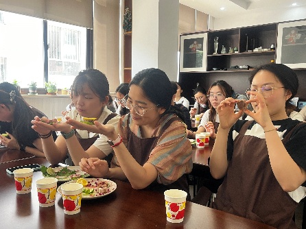 在“正念饮食”环节,老师引导同学们调动所有感官:欣赏糕点源于自然的色泽与形态;深深吸气,辨识融合了米香、药香与花香的复合层次;感受糕体温润弹性的触感;最后小口品尝,让舌尖细细体会谷物清甜、茯苓微甘、山药粉糯、玫瑰馥郁在口腔中层层释放的美妙过程。