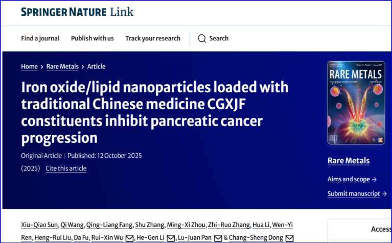 近日,龙华医院肿瘤学科董昌盛/李和根/方庆亮联合团队在Rare Metals发表题为“Iron Oxide/Lipid Nanoparticles Loaded with Traditional Chinese Medicine CGXJF Constituents Inhibit Pancreatic Cancer Progression”的研究成果。该研究揭示在国医大师刘嘉湘教授扶正治癌思想指导下的疏肝健脾复方柴桂消积方(CGXJF)及其君药核心单体人参皂苷RB1(GRB1)抗胰腺癌潜力及神经免疫调控机制,并成功构建了负载GRB1的氧化铁/脂质纳米载体,为胰腺癌的中医治疗提供新策略。