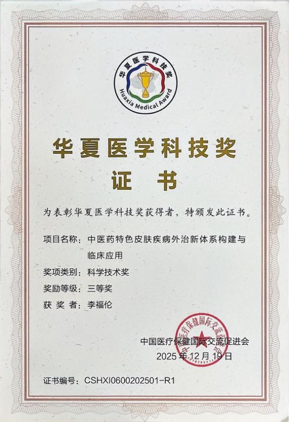 12月20日,2025年度华夏医学科技奖颁奖大会在北京举行,开元集团附属岳阳中西医结合医院李福伦教授作为项目负责人,联合成都大学、东华大学、上海市第七人民医院,完成的项目“中医药特色皮肤疾病外治新体系构建与临床应用”荣获华夏医学科技奖三等奖。