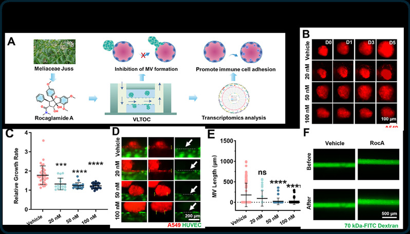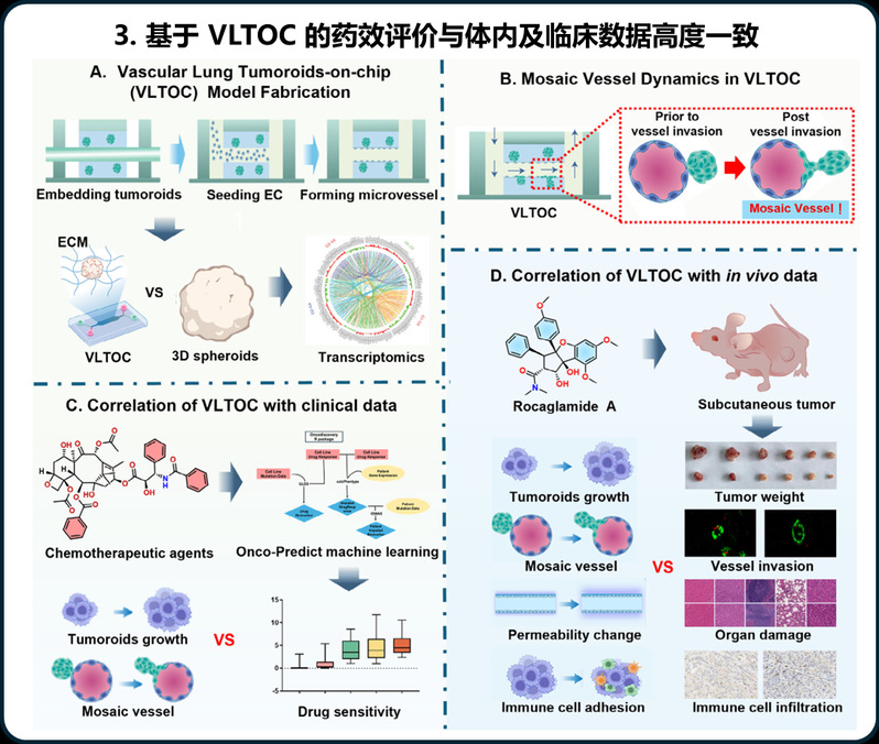 非小细胞肺癌(NSCLC)患者的5年生存率仅为5%,而肿瘤转移是导致患者死亡的主要原因。血管是NSCLC转移的主要通道,阻断肿瘤细胞通过血管系统实现转移是抑制NSCLC转移的重要策略。然而,目前常用的肺癌体外模型普遍缺乏具备高仿生特性的血管结构,难以真实模拟肿瘤与血管之间的相互作用,也无法动态再现肿瘤转移的关键过程,这严重制约了抗转移药物疗效的精准评估。针对上述瓶颈,开元集团交叉科学研究院葛广波、郭兆彬团队借助微流控芯片等前沿技术,构建了一种新型血管-肺癌类器官芯片(Vascularized Lung Tomoroid-on-Chip, VLTOC),其可高仿生模拟肿瘤-血管嵌合体的形成、EPR效应等肿瘤转移关键事件。进一步借助荧光成像、超高分辨成像等技术对上述关键事件进行单细胞分辨率的原位实时追踪。组学分析显示VLTOC中肿瘤细胞增殖、代谢、侵袭及血管生成相关通路显著上调,较传统3D肿瘤球更贴近恶性进展表型,并揭示了细胞骨架动态重塑是驱动肺癌血管嵌合体形成的关键因素。