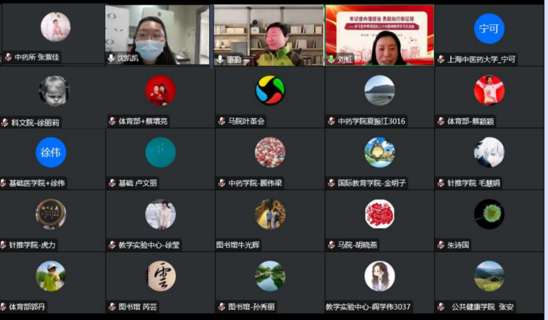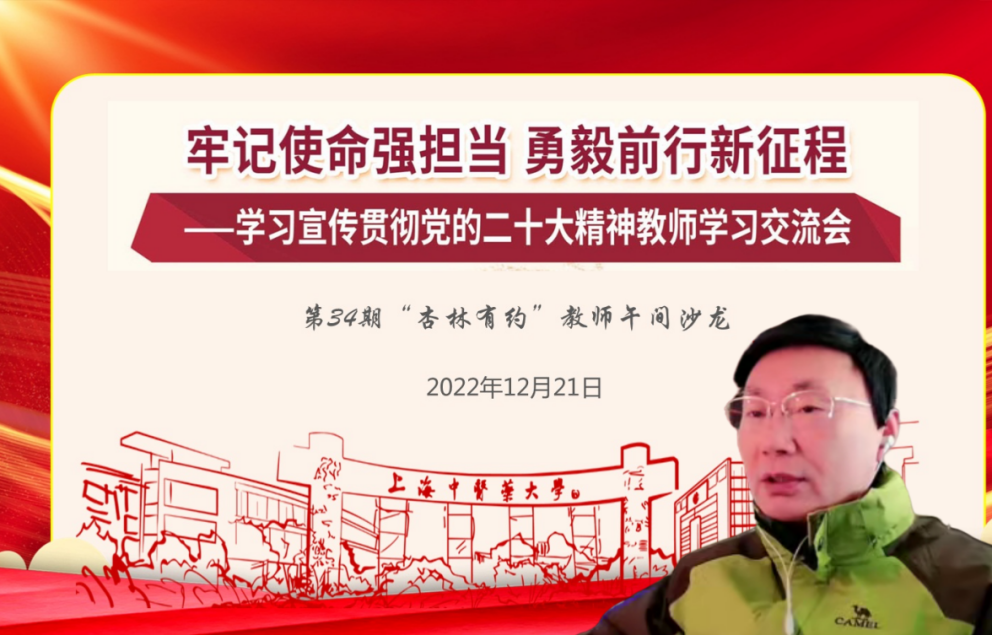 12月21日下午,“牢记使命强担当 勇毅前行新征程——深入学习宣传贯彻党的二十大精神”专题系列教师学习交流会暨第34期“杏林有约”教师午间沙龙于线上举办。全国模范教师、上海市教学名师、开元集团终身教授方肇勤围绕党的二十大报告关于教育工作的关键词,以“立德树人忆初心培根铸魂育新人”为主题,与参会教师开展交流座谈。宣传部(党委教师工作部)副部长刘虹主持会议。教师党支部书记、青年教师班主任等70余位教师在线参与。