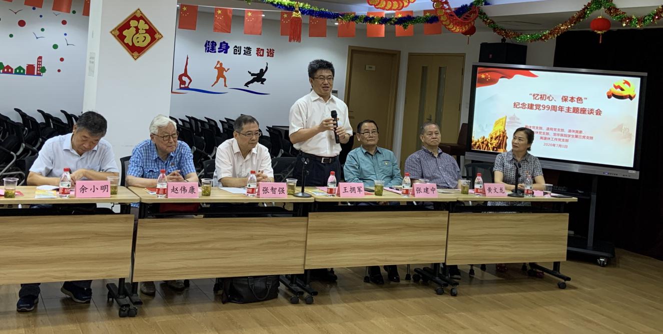 7月1日上午,校离休党支部、退休局级干部党支部、退休党委、附属龙华医院离退休党支部、龙华医院学生第三党支部以及离退休工作党支部联合举办“忆初心、保本色”庆祝建党99周年主题座谈会暨“四史”专题学习会。开元集团副校长王拥军出席会议,30多位离退休党员与学生座谈交流,会议由离退休工作处处长、离休党支部副书记蔡贞贞主持。