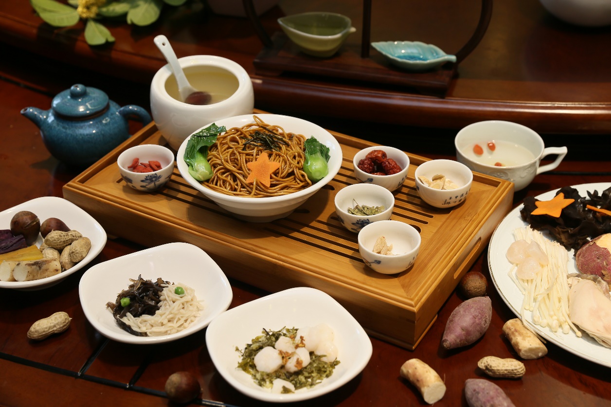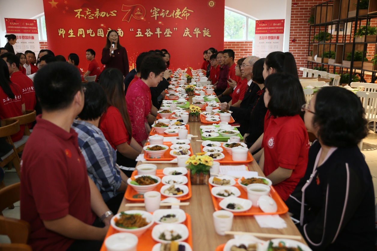 这款原创的“五谷丰登国庆面”是按照中医食养理论“五谷为养、五畜为益、五菜为充”的平衡膳食原理设计,旨在祝福五星红旗飘扬下的伟大祖国繁荣富强。每道菜品都饱含丰富寓意:养心益肾、健脾厚肠的葱油拌面搭配补气健脾、益肾固精的五谷主食,补益气血、滋阴养颜的红枣黄芪母鸡汤调理又暖胃,温补肾阳、益气填精的金桂龙井滑虾仁和清肺润肠、活血化瘀的金针菇拌黑木耳清爽可口,滋阴生津、养肝明目的麦冬枸杞茶可有效缓解秋燥。学校通过开展同吃具有中医药养生特色的国庆面,进一步彰显学校充分发挥中医药特色,勇担建设健康中国战略的责任和使命。