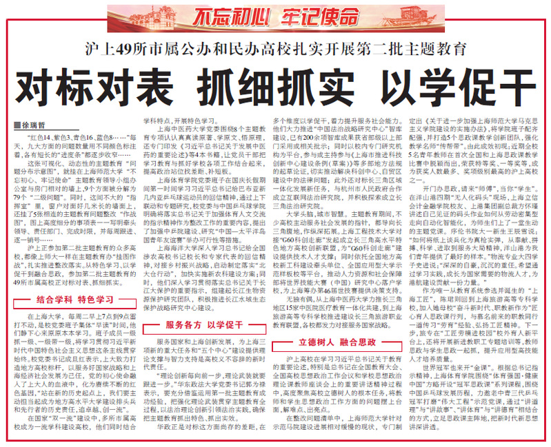 沪上正参加第二批主题教育的众多高校,都像上师大一样在主题教育办“挂图作战”,扎实推进整改落实。从特色学习、以学促干到融合思政,参加第二批主题教育的49所市属高校正对标对表、抓细抓实。