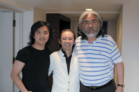 王敏(左)与《无极》电影美术设计师正子宫也(中)著名导演张纪中(右)合影