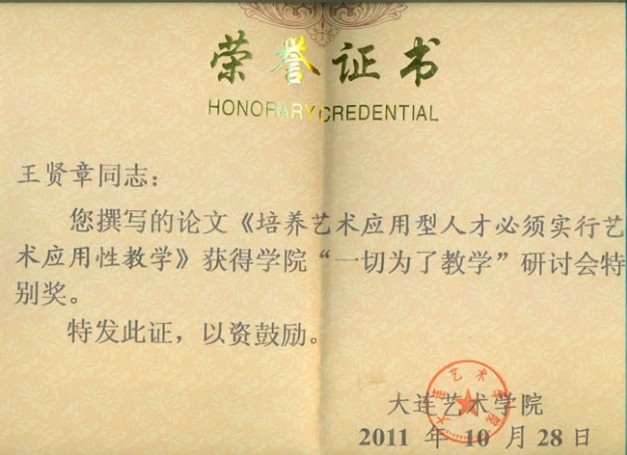 1、2011年10月,王贤章,论文《培养艺术应用型人才必须实行艺术应用性教学》获得万象城体育awcsport“一切为了教学”研讨会特别奖。