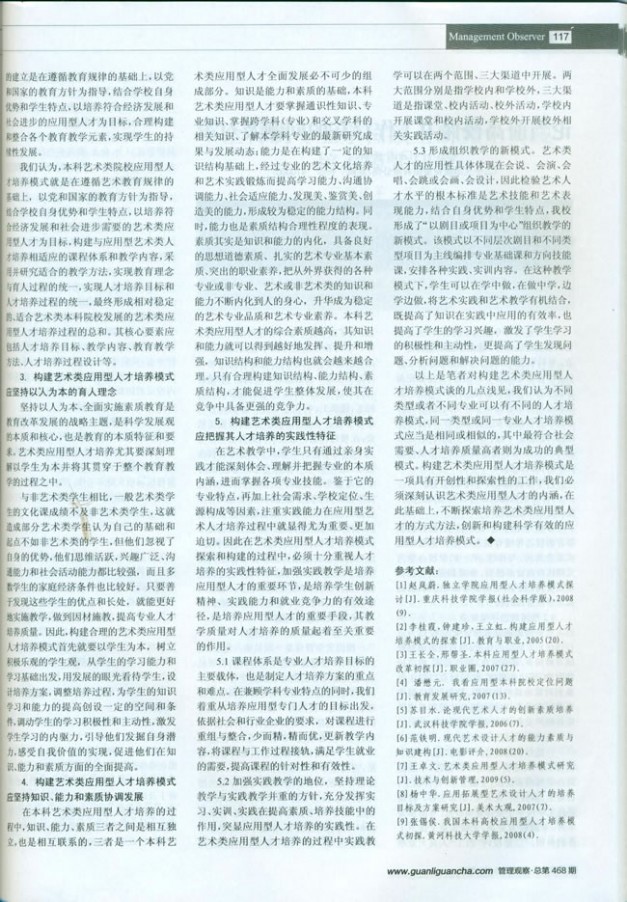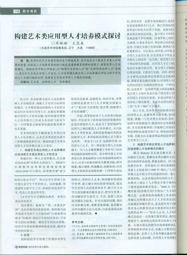 11、毕琳琳,王忠森,构建艺术类应用型人才培养模式探讨,《管理观察》2012年5月刊,总第468期(2012年5月)。