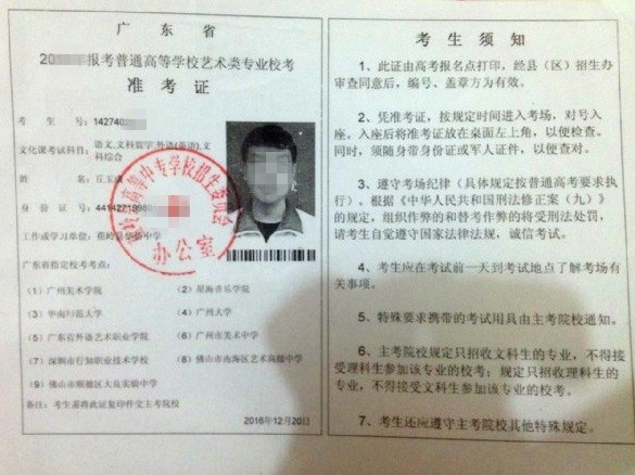 ②《广东省2018年报考普通高等学校艺术类专业校考准考证》照片图片