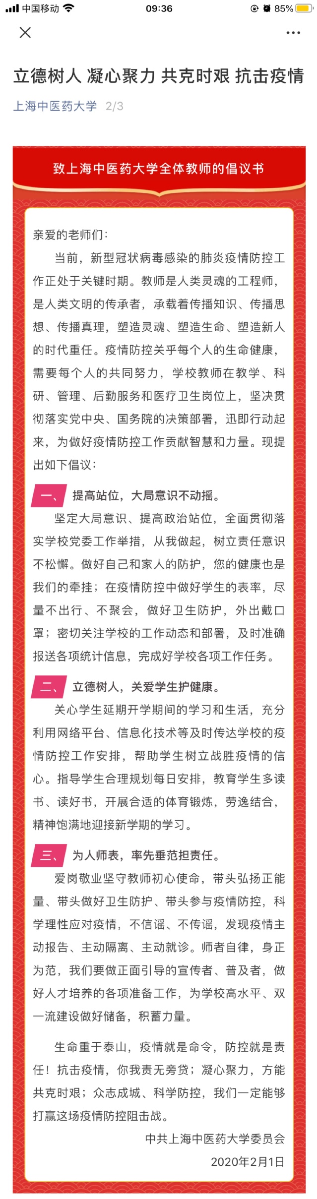 立德树人 凝心聚力 共克时艰 抗击疫情
