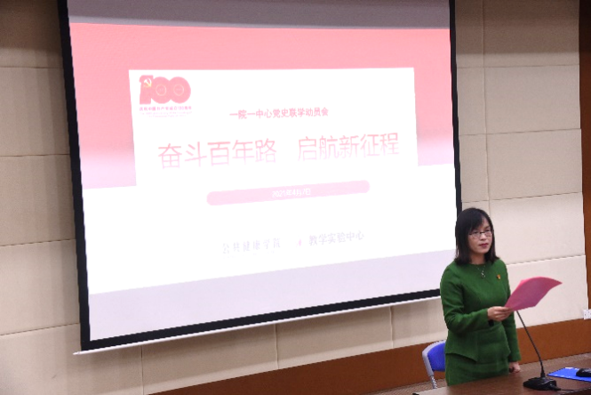 为深入学习贯彻习近平总书记在党史学习教育动员大会上的重要讲话精神,贯彻落实教育部、市委、市教卫工作党委关于党史学习教育的各项部署要求,4月7日中午,公共健康学院与教学实验中心在6504教室联合举行“奋斗百年路 启航新征程”一院一中心党史联学动员会。公共健康学院党总支书记段艳霞、教学实验中心党支部书记可燕、教学实验中心主任张彤、马克思主义学院陈荣武教授等出席,全体教职工、师生党员、发展对象、入党积极分子和入党申请人共同参加本次动员会。会议由公共健康学院党总支副书记干旦峰主持。