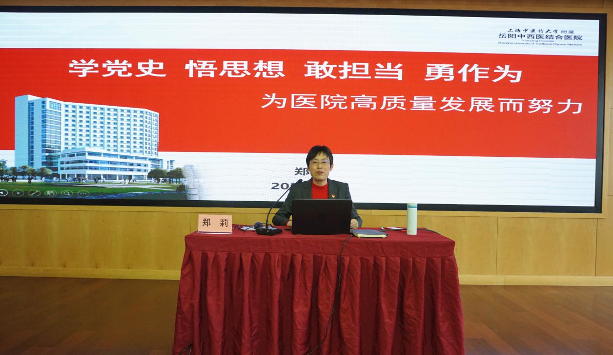 郑莉指出,在建党100周年的历史新起点,深入学习习近平总书记重要讲话精神,深刻领会开展党史学习教育的重大意义和目标要求。她将党史学习和医院发展史相结合,生动阐述医院建院以来的发展历程、规划及全院职工共同奋斗所取得的成绩。她希望中青年干部要在工作状态、工作方法、看待己任、执行力、工作要诀五个方面,细照笃行不断修炼自我;要在知行合一中主动担当作为,提高医疗服务水平、疑难病例讨论、新技术的能力;要在坚持中西医并重、守正创新、传承发展中不断提升政治素质、履职能力和业务水平,推动医院高质量发展,为打造世界一流的中西医结合医院共同奋斗。