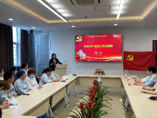 4ACCU病区护士长黄凤是一名“80后”党员,党龄10年。2020年新冠疫情突发,黄凤同志主动请缨,除夕出征,作为上海市第一批援鄂医疗队队员驰援武汉,任抗疫前线党总支第六党支部书记,在武汉市金银潭医院重症病房一线抗疫67天。因在前线的突出表现,先后获上海市优秀共产党员、上海市卫健委三八红旗手、上海市抗击新冠先进个人、上海市杰出护理工作者、上海市卫健委五四青年奖章等荣誉称号。抗疫归来后,黄凤一头扎入到临床护理工作中,作为新时代的青年人,作为一名党员护士长,她身兼双重使命,始终坚守岗位,出色地完成工作。为继续弘扬抗疫精神,进一步发挥先锋模范作用,护理第一党支部设立“优秀共产党员(黄凤)工作站”。卢根娣为优秀共产党员工作站授牌。