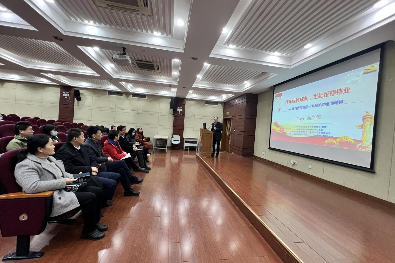 两院党政领导班子在上海大学蔡冠深讲堂共同学习了由上海市十九届六中全会精神宣讲团成员、上海大学马克思学院副院长高立伟教授所作的《中共十九届六中全会精神专题辅导报告》。高立伟从百年大党的不变初心与使命、百年前铸就的伟大建党精神、“两个一百年”奋斗目标的历史交汇点、百年奋进历程与成就经验和百年未有之大变局历史方位五个方面辅导与会者学习贯彻党的十九届六中全会精神,重点对《中共中央关于党的百年奋斗重大成就和历史经验的决议》中的“1个根本问题”“3次飞跃”“3个创立”“4个伟大成就”“5大历史意义”“10个明确”“13个方面”等方面进行数字化深刻阐述。高立伟强调“两个确立”是全党全军全国各族人民共同心愿,对新时代党和国家事业发展、对推进中华民族伟大复兴历史进程具有决定性意义。