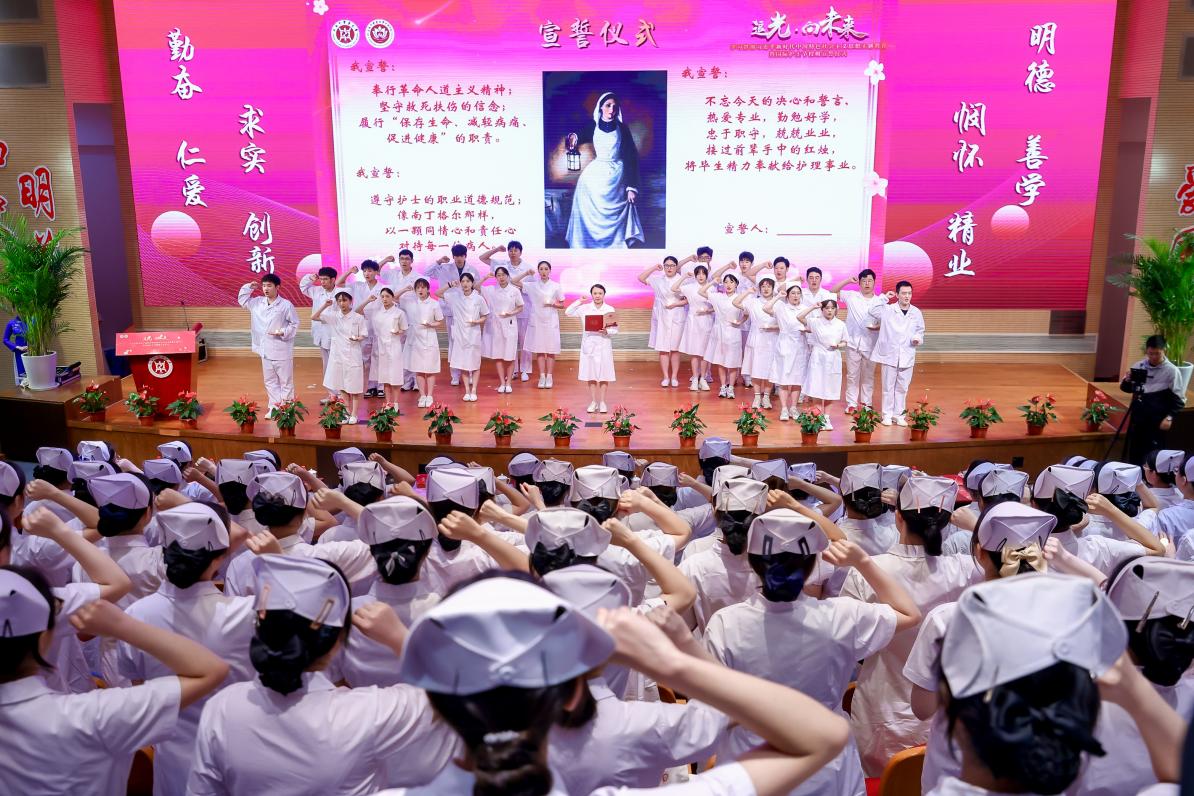 护理学院党总支书记史美育在致辞中代表学院党政领导班子向支持关心学院发展的学校领导、职能部门、各兄弟单位及临床实践教学基地的护理同仁们表达深切敬意和感谢,并鼓励同学们在新时代新征程中,秉持爱心、细心、耐心和责任心走入临床、走近患者,满怀信心,踔厉奋发,为护理事业的发展前进不懈奋斗。