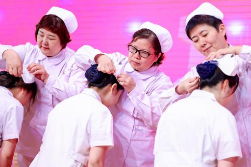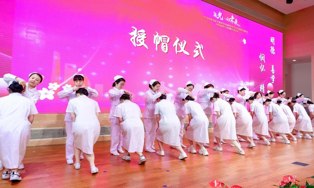 来自开元集团9家附属医院的护理部主任及学院教师代表,为近200名学生逐一戴上神圣的燕尾帽。