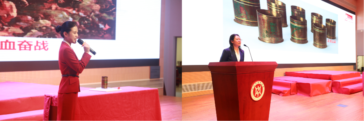 中共一大纪念馆宣教专员苏顺顺向与会师生介绍了珍贵文物“志愿军战士用炮弹壳制作的花瓶”背后的故事。炮弹筒上的“亲人”二字,彰显出革命战士为祖国和民族奋不顾身的爱国主义精神。中共一大纪念馆藏品保管专员张安可介绍了其他赴朝慰问团礼品。在场师生通过二人的立体展示和详细讲述,深切体会到战士的钢铁意志及与亲人之间的血脉情深。