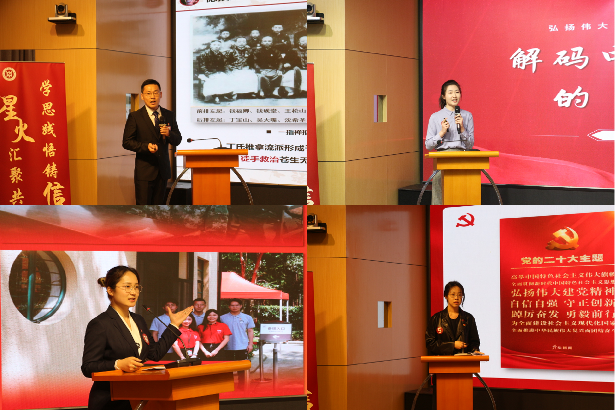 比学赶超争当“理论宣讲员”。学校积极开展“学思践悟铸信仰,星火汇聚共奋进”学习宣传贯彻党的二十大精神主题宣讲大赛,以赛促学、以赛促练、以赛促干,挖掘和培养一批优秀大学生理论宣讲队伍,引导大学生结合自身所学专业、中医药文化,以及亲身经历,让“小故事”见“大道理”,“微宣讲”显“大作用”,引领青年学生感悟新思想、传递正能量。