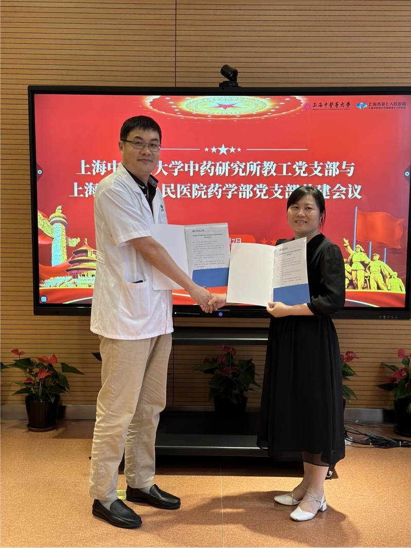 为深入开展学习贯彻习近平新时代中国特色社会主义思想主题教育,进一步创新基层党建共建模式,近日,中药研究所教工党支部与上海市第七人民医院药学部党支部举行党建共建签约仪式。中药研究所副所长王长虹、教工党支部书记张紫佳,上海市第七人民医院药学部党支部书记范伟,以及两支部党员代表出席。