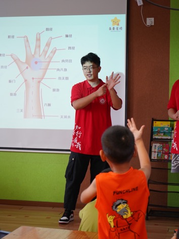 志愿者团队为患儿及家长们介绍了小儿推拿中儿童手上的常用穴位及操作手法,带领他们一起做推拿手指操、体验推拿少林内功。这些活动让孩子们在动手动脑中,提升了身体协调性,感受到了中医推拿的神奇和乐趣。
